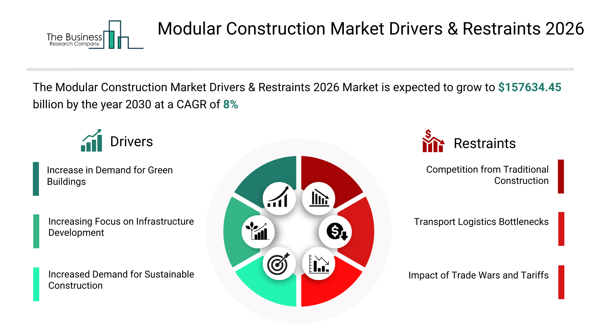Increase In Demand For Green Buildings - The increase in demand for green buildings will become a key driver of growth in the modular construction market by 2030. As sustainability and eco‑friendly practices gain importance among developers, policymakers and end users, there is a rising focus on reducing waste, conserving energy and minimizing environmental impact in construction projects. Modular construction supports these sustainability goals by enabling controlled off‑site manufacturing, reducing material waste and optimizing energy use in buildings. Developers are increasingly seeking solutions that comply with green building standards and certifications, making modular construction a preferred approach. The adoption of energy-efficient and eco-friendly designs is expected to continue driving the expansion of modular construction globally. As a result, the increase in demand for green buildings is anticipated to contributing to a 1.6% annual growth in the market.